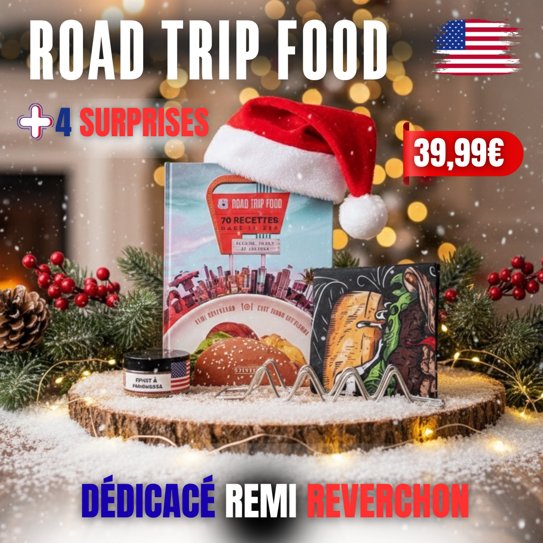 Cette box exclusive contient 70 recettes made in USA avec le livre dédicacé par Rémi Reverchon, un support tacos pratique, un pot d’épices spécial hamburger et un tablier typique pour cuisiner sans te salir. Idéal pour vivre l’expérience culinaire américaine tout en savourant un match de basket.